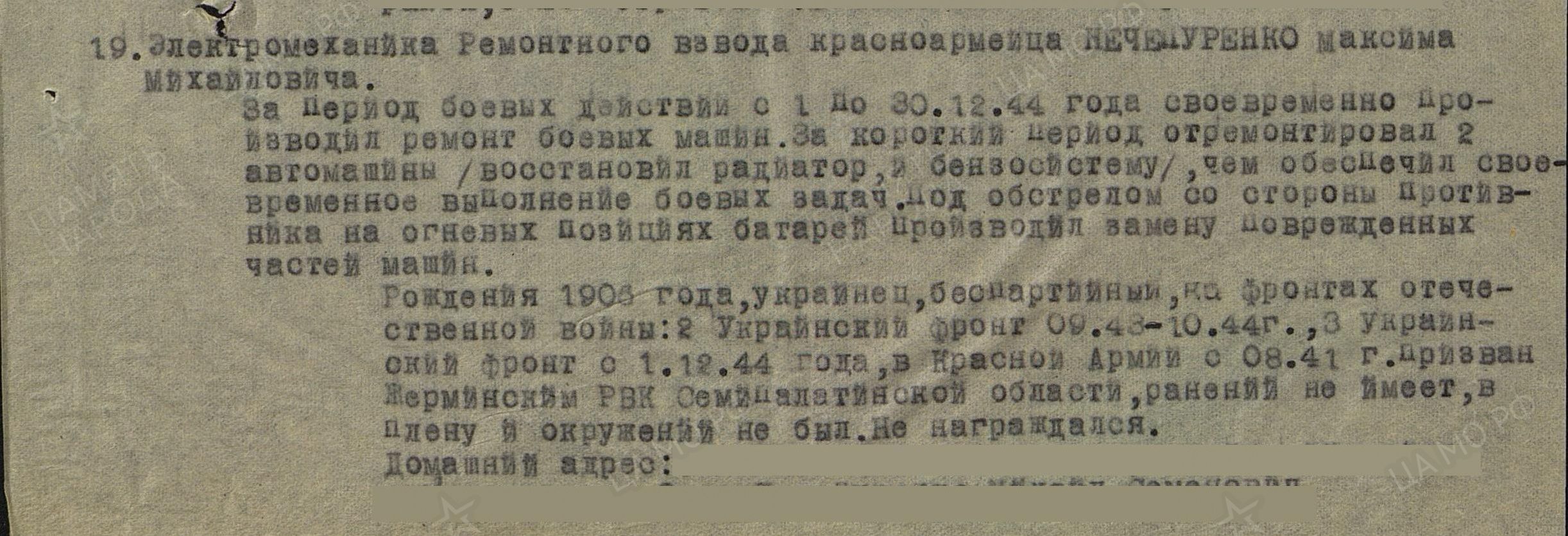 Максим Михайлович родился в 1906 году в с. Марловка Жарминского района Семипалатинской области Казахской ССР. Летом 1941 года был призван в ряды Советской Армии, служил в 787 артиллерийском Кишиневском полку 252 стрелковой Харьковской Краснознаменной орденов Суворова и Богдана Хмельницкого дивизии, 2 Украинского Фронта, 3 Украинского Фронта электромехаником по ремонту военной техники. После окончания войны работал механиком в совхозе «Скотовод» Казахской ССР. Награжден Медалями «За отвагу», «За боевые заслуги» и юбилейными медалями. |