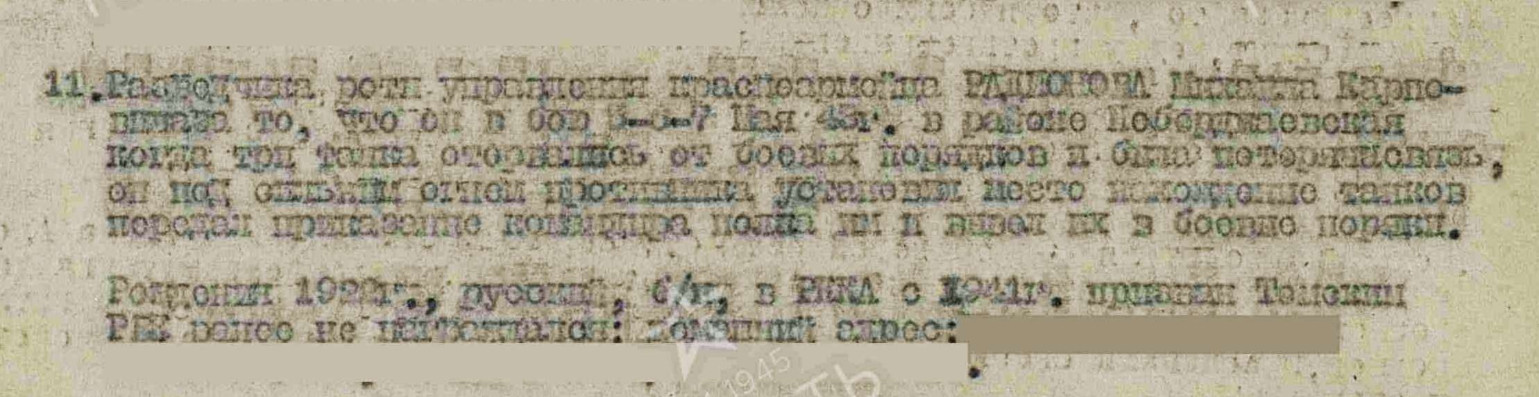 Михаил Карпович родился 21 ноября 1922 года в деревне Радионово Заварзинского Сельсовета Томского района Новосибирской области В октябре 1941 года был призван в Советскую Армию. В 1942 году закончил школу радистов в г. Новосибирске, а затем был зачислен разведчиком в состав 257 танкового полка, 222 танковой бригады. Освобождал города Туапсе, Краснодар, станции Смоленую, Холмскую, Обинскую, Крымскую. 21 сентября 1943 года красноармеец Радионов М.К. получил тяжелое ранение и был направлен в госпиталь, сначала в г. Краснодар, потом в г. Сочи и затем в г. Томск. В октябре 1944 года по заключению медицинской комиссии был демобилизован. Очень долго жил с осколком в ноге. Радионов Михаил Карпович награжден Орденом Отечественной войны I степени, Орденом Красной Звезды, дважды награжден медалью «За отвагу», медалью «За победу над Германией». |